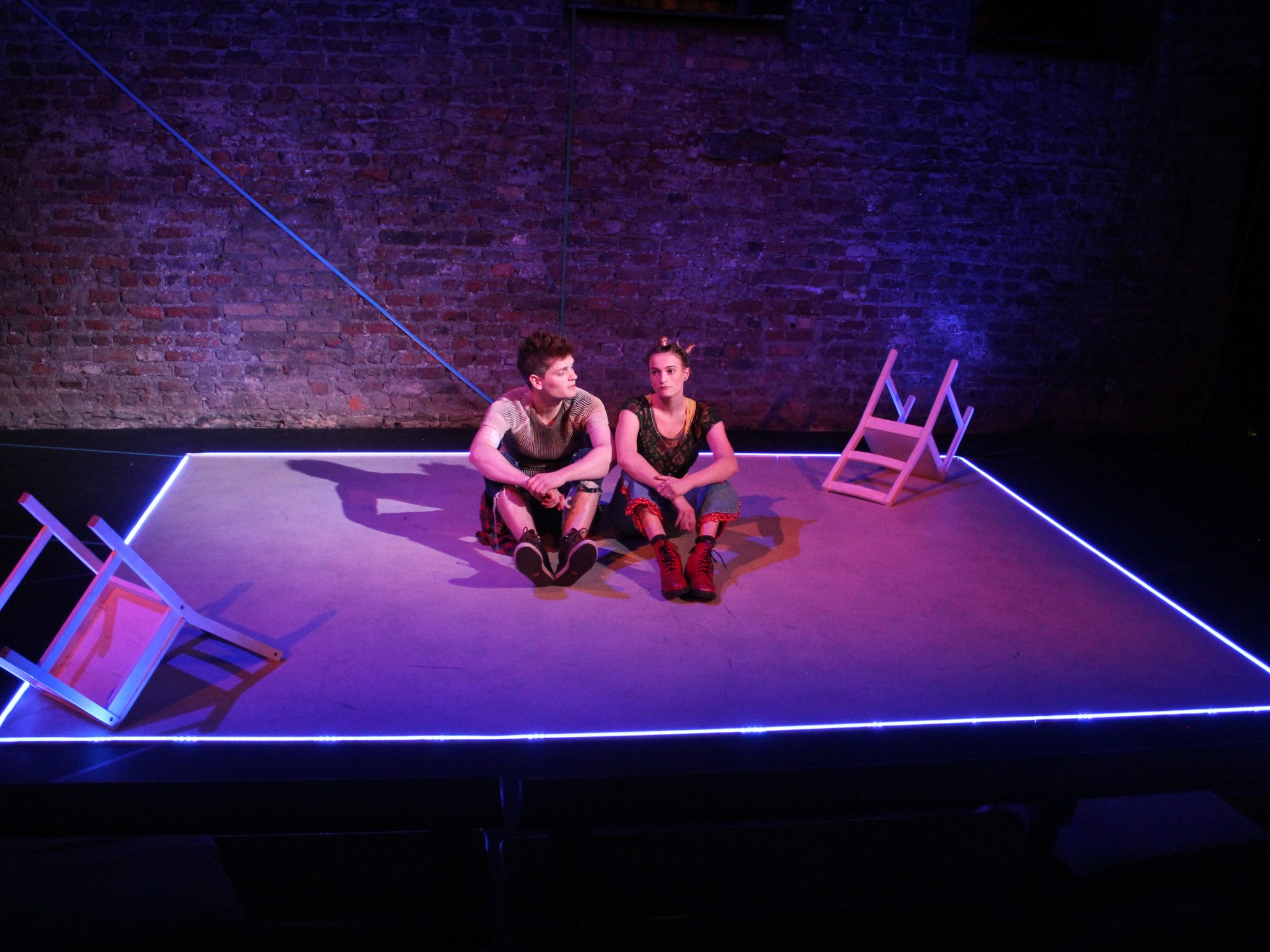 An Enda Walsh double bill of Disco Pigs and Sucking Dublin was produced by Reality Check Productions in December 2017 in Smock Alley Boy’s School. The set was inspired by the refracting of light, using color to tie the many levels of the space together as the director wanted the cast to inhabit every inch of the theatre. A clean white space with surrounded by strips of color allowed the vast array of scenes to be imagined through atmospheric lighting and a creative use of furniture and props.