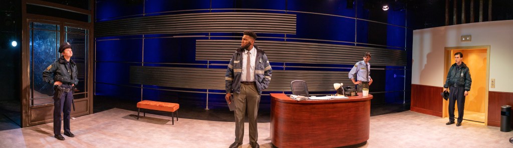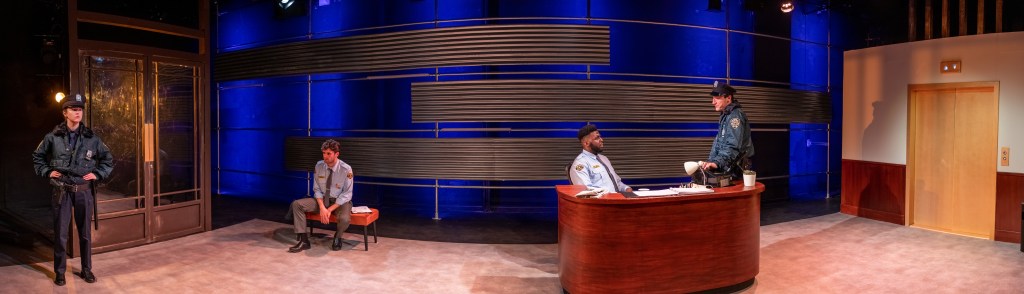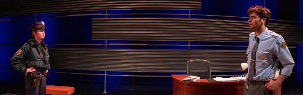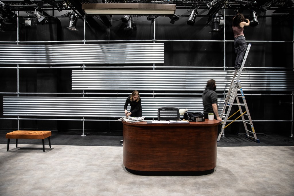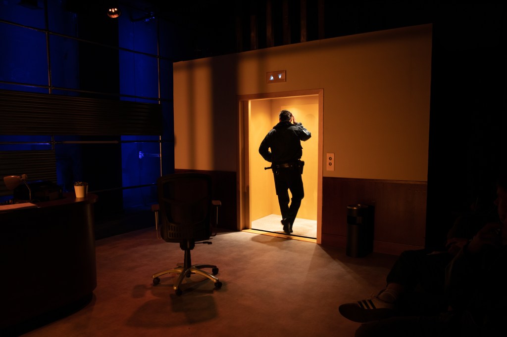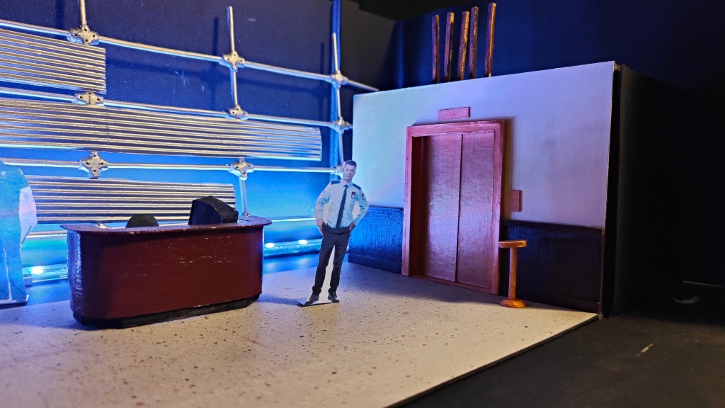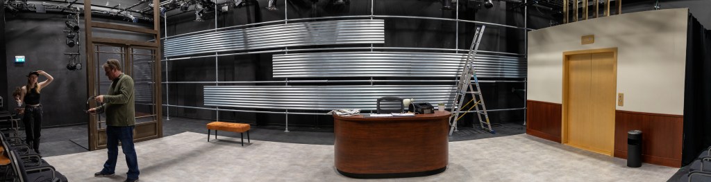 Returning to design in my alma mater The Lir was a wonderful experience, particularly as it was Loughlin Deegan’s final year as the school’s Director. As I had designed two productions in Studio Two during my MFA I was particularly aware of the space’s limitations. The director Annabelle Comyn and myself were interested in creating a wide lobby space with the exterior world creating the backdrop inspired by Andreas Gursky’s series of photos entitled ‘doormen’ as well as long exposure city photography. Working with the in house team as well as the students themselves was a very rewarding experience and a great chance to work with the next generation of theatre makers!