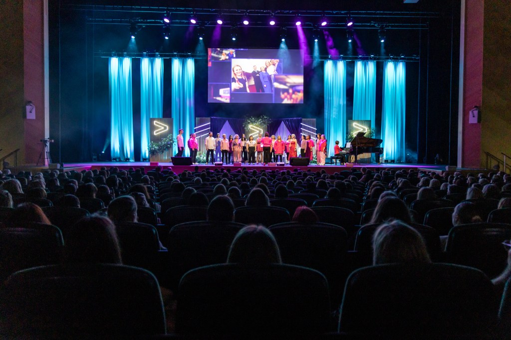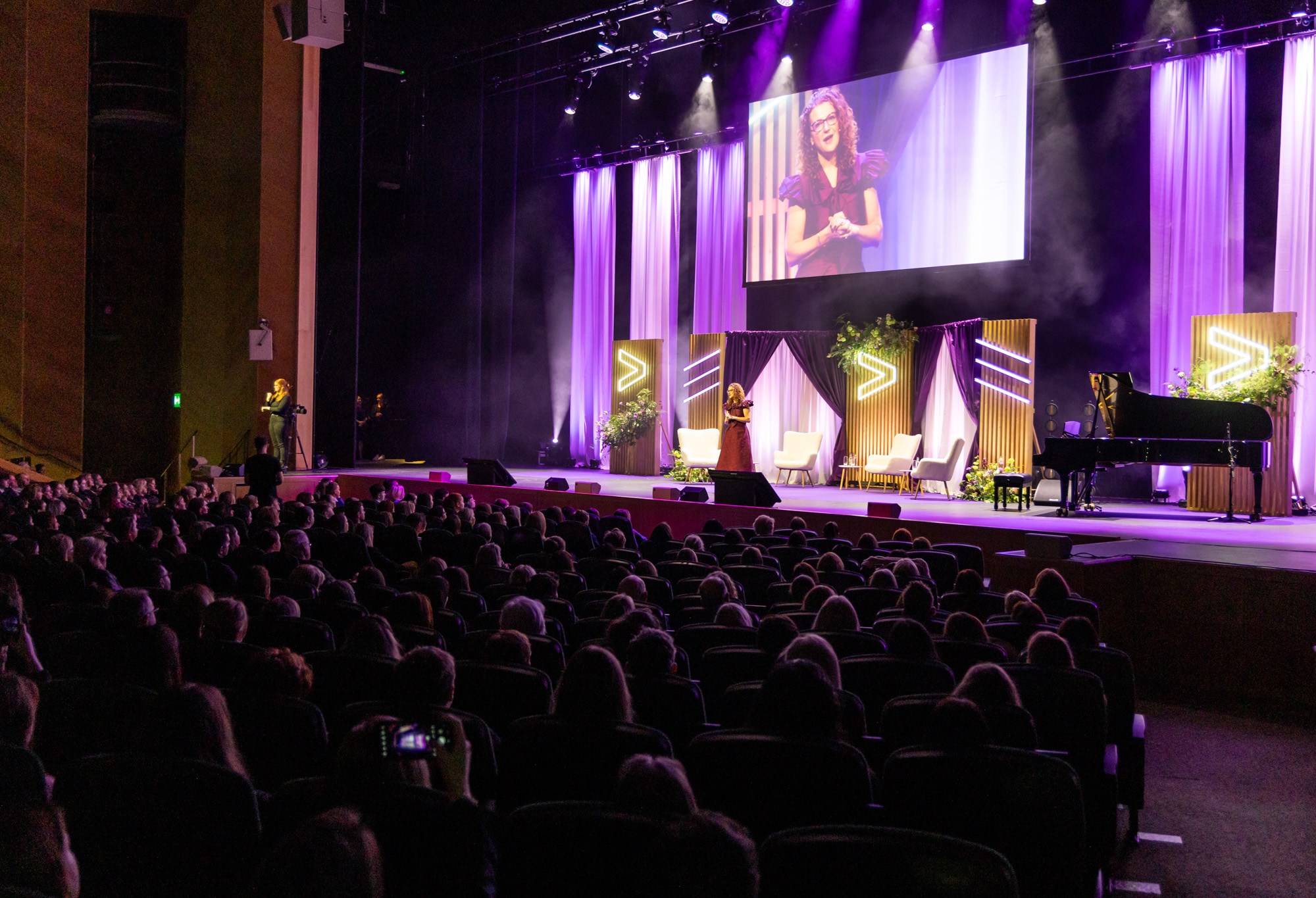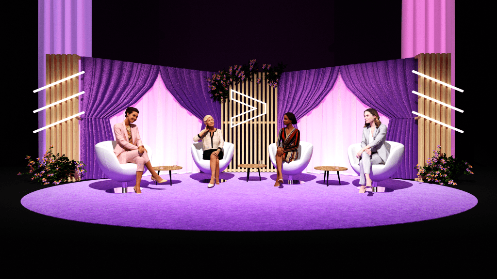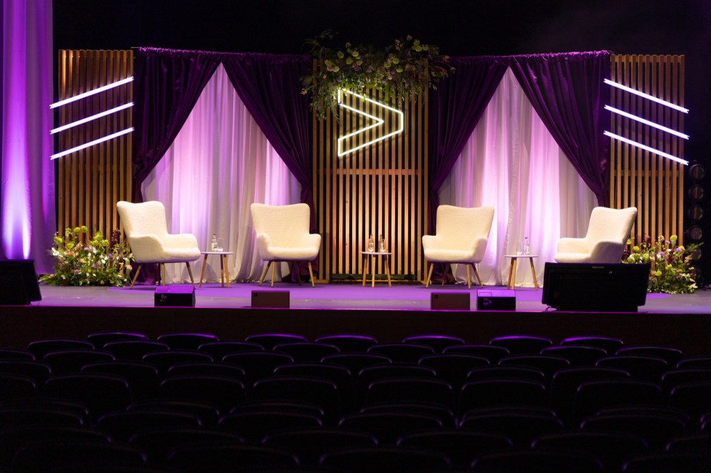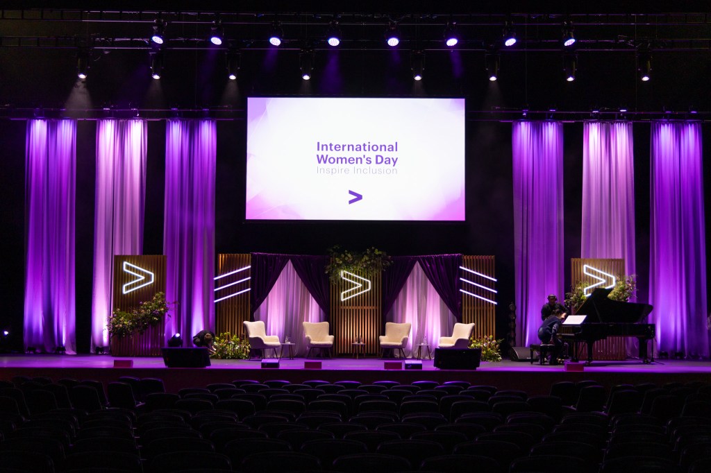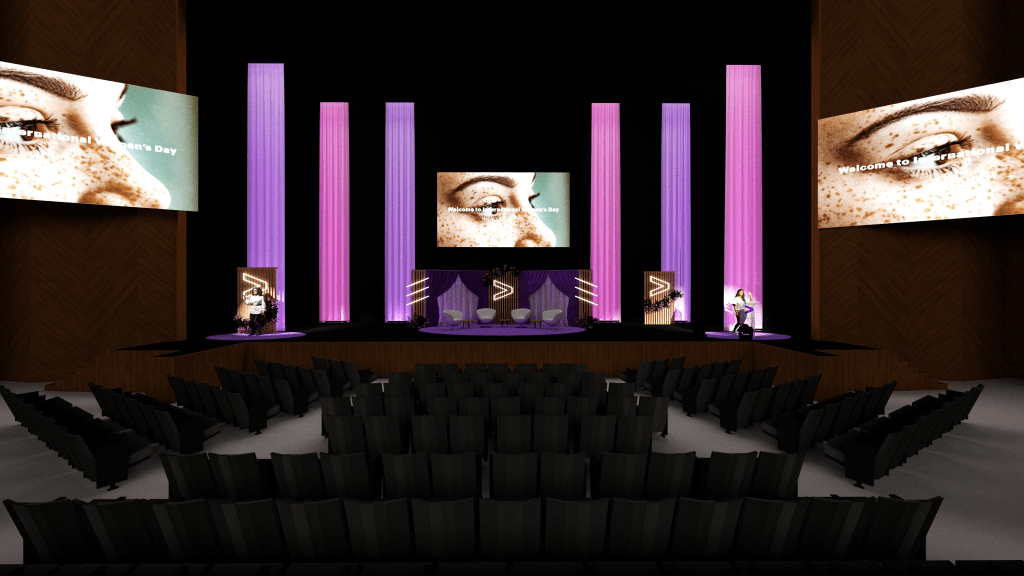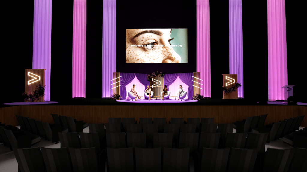 International Womens Day was marked by Accenture by a day long event in the Convention Centre Dublin Auditorium Space. The space was inspired by casual style chat shows to create a warm and comfortable experience for the panel discussions and speakers. Live performances and pre-recorded content broke up the day which had to be considered from the beginning in the design. The large fabric columns allowed for Accenture to set the scene with their brand color while also responding to the content on the stage at any given time.