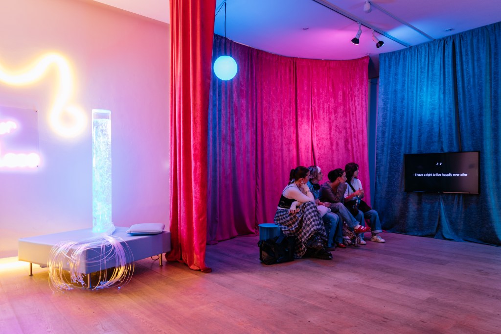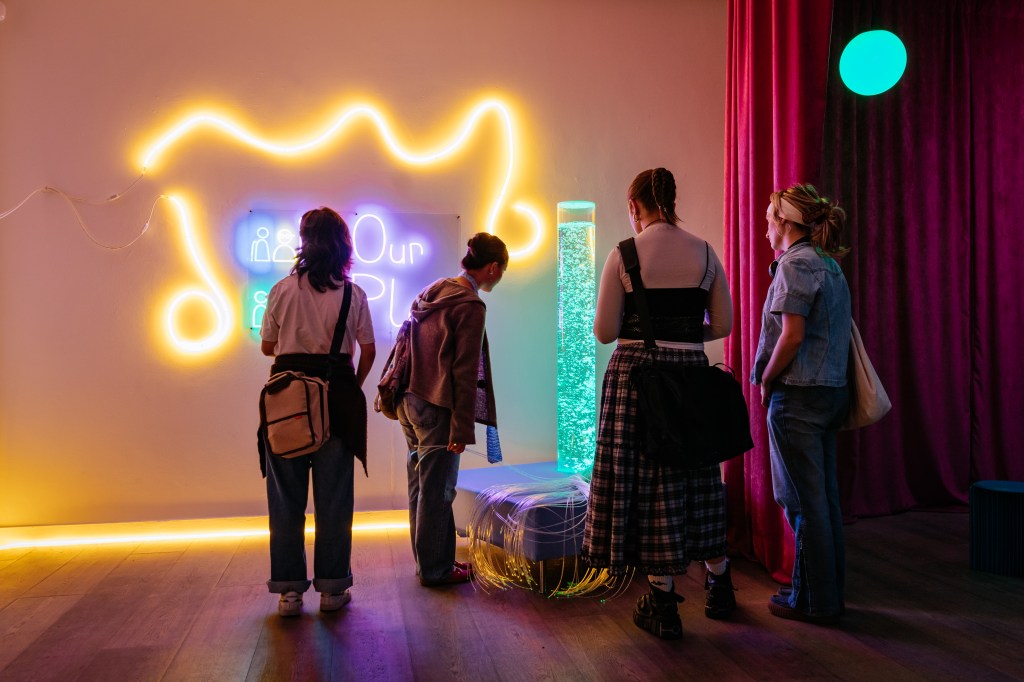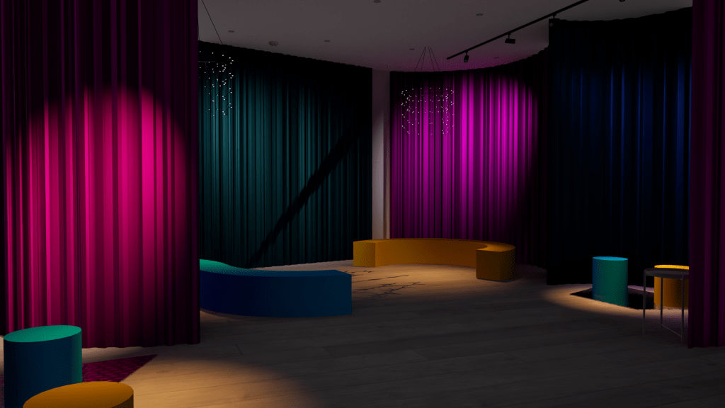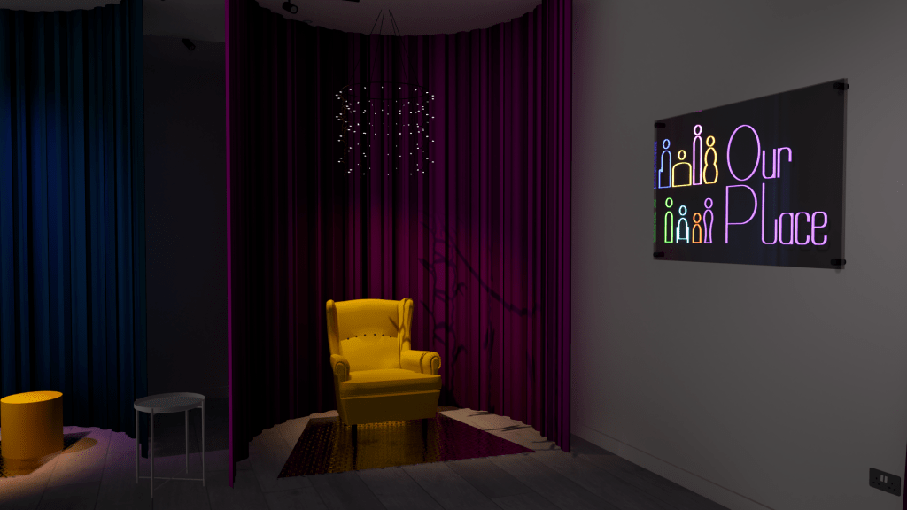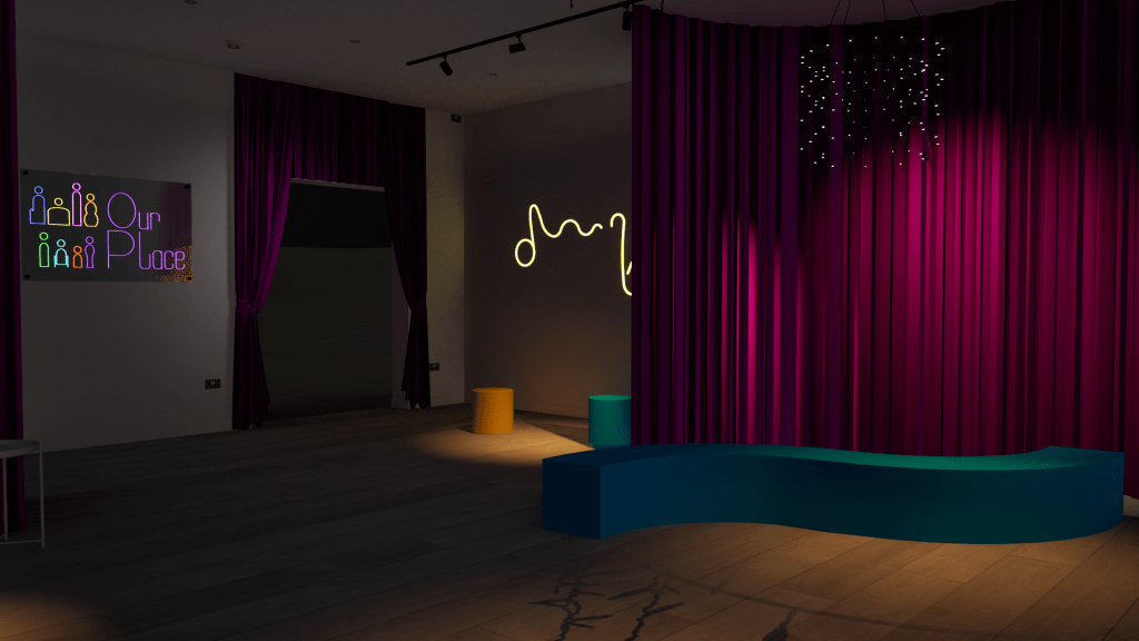 ‘Our Place’ was a multi-sensory installation that explores themes of happiness, human rights, and belonging. The installation features an immersive sound artwork played through 10 speakers, a vibrant neon artwork, and tactile light artworks. Exhibition accessibility additionally included Lámh sign language video, braille, audio and captioned descriptions. My task was creating a space that responded to the artists involved, considering not only their needs but what they believed Our Place was all about. The exhibition featured distinct sensory areas with both group and individual seating to allow people to enjoy the exhibition together in whichever way they felt most comfortable.